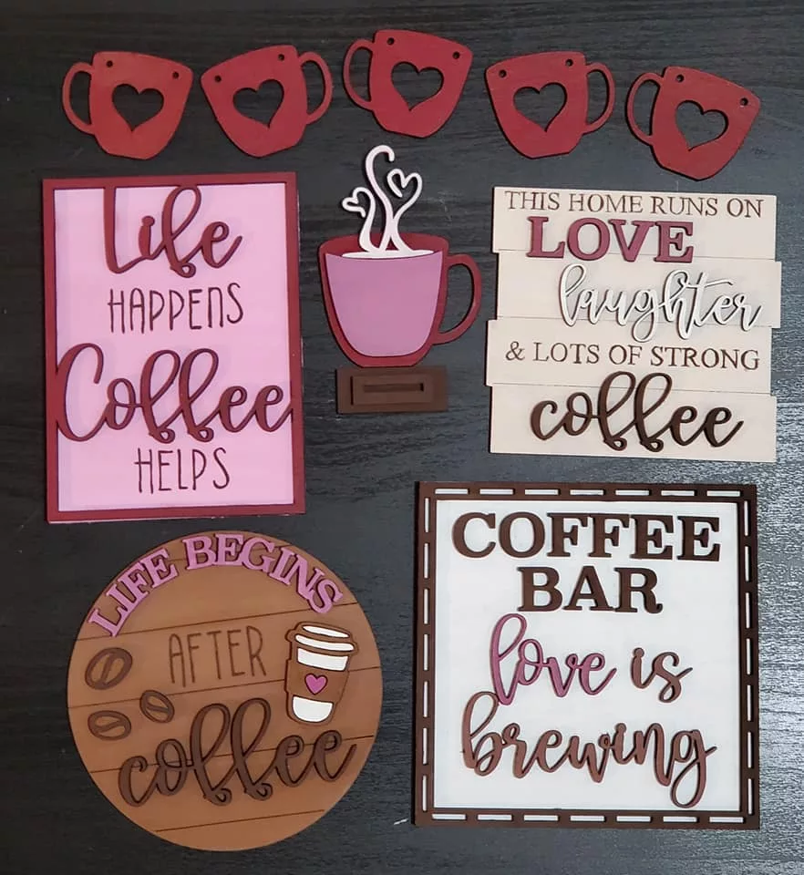 Coffee tiered tray set. All pieces shown in the photo is included. Layered and etched. These are blanks.