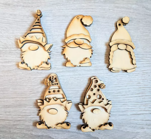 Included in this set is 5 variety of Gnome ornament. Layered pieces. Unfinished.