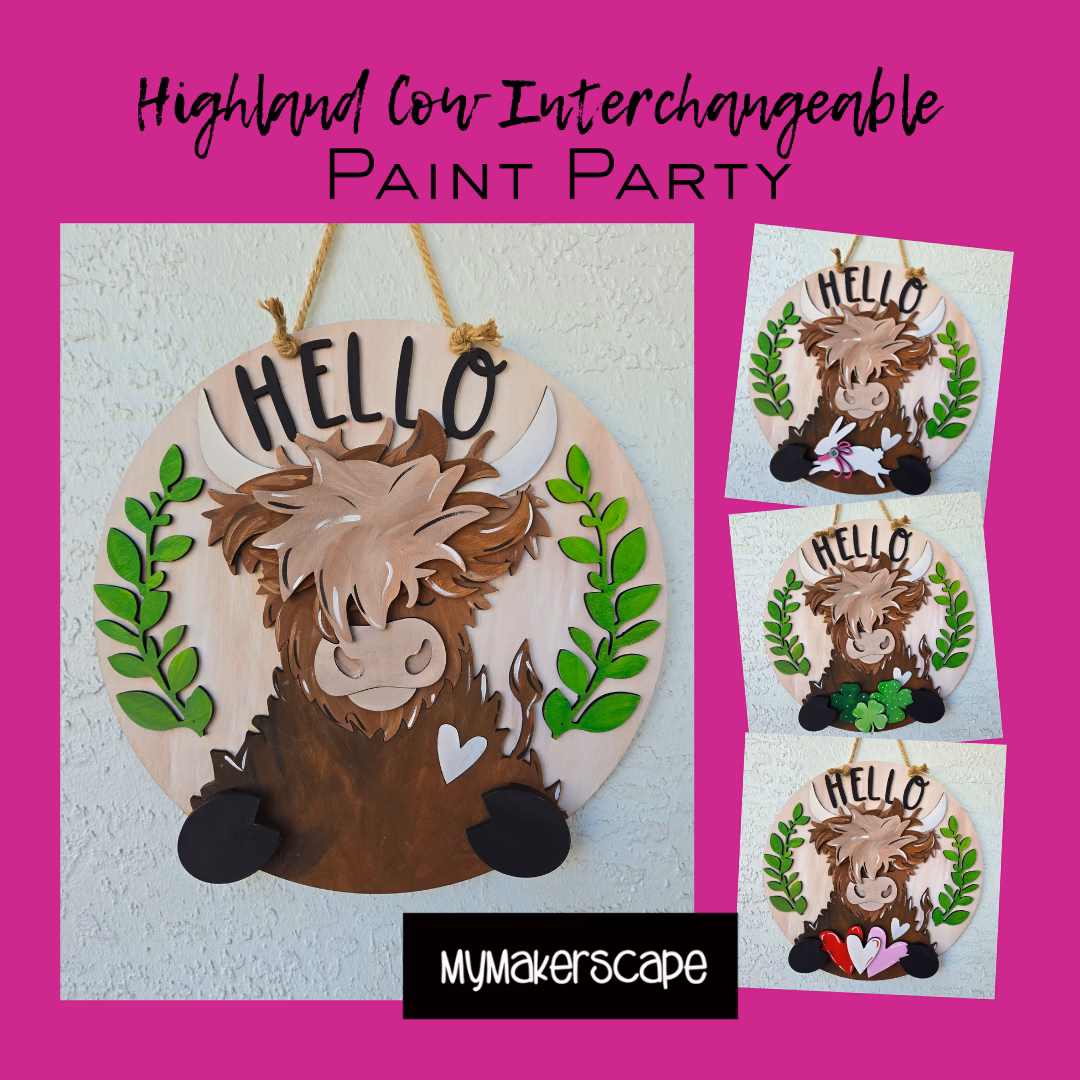 Join us for a fun evening painting your very own Highland Cow Interchangeable Sign. This sign measures 15″ round, cut with 1/4 birch wood. Layered design. All inserts included. No experience needed. Step-by-step instruction. All supplies included.