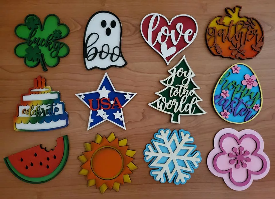 Paint your very own HOME interchangeable sign! This sign measures 10×19, layered frame. Cut with 1/4 birch wood. Included are 12 holiday insert. Each holiday insert is a layered design.