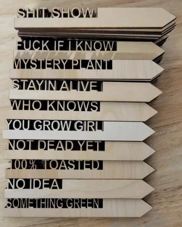 Humor Garden Stakes measures 6.75 x .75. Cut with 1/4 birch wood.