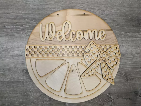 This is a layered shiplap round lemonade with bow and welcome door sign hanger. Measures 18 inches in round.