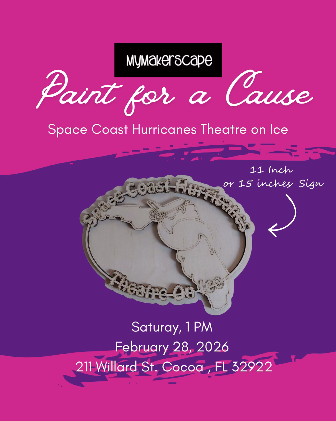 Join us for a fun paint party while supporting an incredible local team! Proceeds from this event will help the Space Coast Hurricanes Theatre on Ice reach their next competitive goals.  Choose the size you want – 11 inch width or 15 inches width. This comes unfinished and ready for you to paint. Cut using 1/4 birch wood, layered design.  Step-by-step instructions. No experience needed. All supplies included.